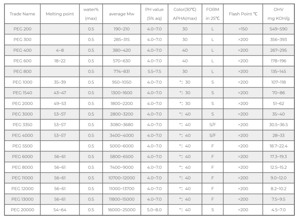 PEG-1000 سے PEG-4000: درمیانے سالماتی وزن ، مومی سالڈز۔ جیسے جیسے سالماتی وزن بڑھتا ہے ، لہذا واسکاسیٹی اور پگھلنے والے مقام کو بھی کریں۔ مثال کے طور پر ، PEG-3350 دواسازی میں عام طور پر استعمال ہونے والی سپیوزٹری اور مرہم کی بنیاد ہے ، جو اچھی شکل اور منشیات کی رہائی کی کارکردگی کی پیش کش کرتی ہے۔